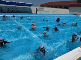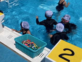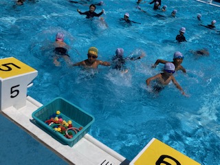 小学校でのプールにも慣れてきた子どもたち。今日は先生たちが[たからさがし]をしてくれました。男の子チームと女の子チームで対戦です。プールに沈んでいるお宝をゲットするために、子どもたちは勢いよく走り回ります。