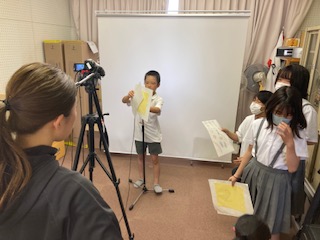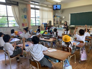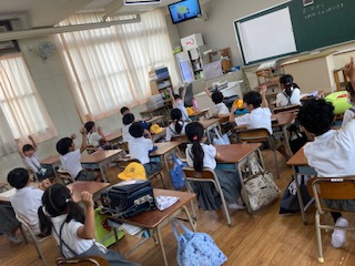 今日の児童集会は暑さも考慮してテレビ放送で行いました。[寿司ネタクイズ]です。集会委員会の子どもたちが事前に先生たちに好きな寿司ネタをインタビューしておいて、それをクイズにしています。[○○先生の好きな寿司ネタは、1△△、2××、3□□、のどれでしょうか?]…3択です。1年生の教室をのぞいてみました。正解すると子どもたちは[やったぁ]と大きな声をあげてガッツポーズをして喜んでいました。