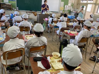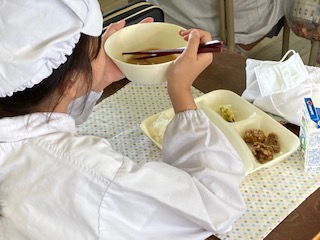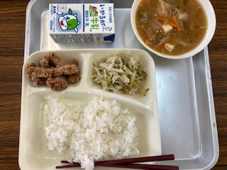 今日の給食のメニューは、豚肉の竜田揚げ、みそ汁、切干し大根のゆずの香和え、牛乳、ごはん、でした。豚肉の竜田揚げは下味がしっかりとついていて、ころももサクッといい感じに揚げられていました。みそ汁はだしがきいていて、とうふ、たまねぎ、キャベツ、にんじん、オクラ、えのきたけと具だくさんでした。切干し大根のゆずの香和えはさっぱりとしたゆずの香りが楽しめました。
