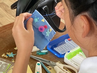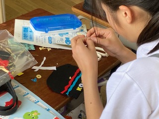 5年生の子どもたちが[小物づくり]に取り組んでいます。5年生になって家庭科の学習も加わり、裁縫にも挑戦しています。玉どめ、玉結びから始まり、基本的な縫い方は習いました。まず最初の課題は小物づくりです。フェルト生地を使って、ペンケースやティッシュ袋、小物入れやマスコットなど、自分の作りたいものを作っていきます。飾りやボタンをつけたり、名前の縫い取りをしたり…、子どもたちが針と糸を手に集中して取り組んでいる姿が見られました。