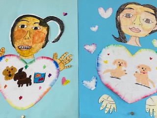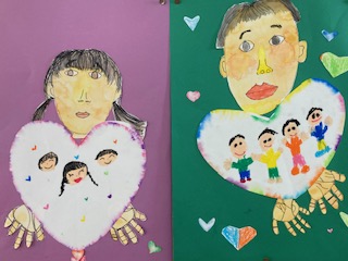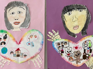 3年生の教室にすてきな子どもたちの作品が掲示してありました。テーマは[わたしの宝物]だそうです。以前に子どもたちが顔と手だけを描いているのを見かけて、何を作っているのかなと思っていたのですが、こういうことだったんですね。真ん中にハートを置いて心の中を表現しています。わたしの宝物、ぼくの大切なもの…、なんだか温かい気持ちになりますね。子どもたちの素直な心が伝わります。ハートも細かくていねいにふちどられているのにも気づいてあげてくださいね。