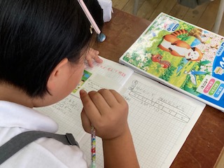 3年生の子どもたちが算数の学習に取り組んでいます。問題場面をとらえて立式します。[○ずつ□こ分]や[一人分は何こ][同じ数ずつ分ける]などのキーワードをもとに、見通しを立てて、かけ算なのかわり算なのか考えて解決していきます。またその際、図を描くことで理解をより深めようとしている子もいました。また自分の考えをとなりのお友だちと積極的に交流する場面もたくさん見られました。