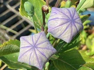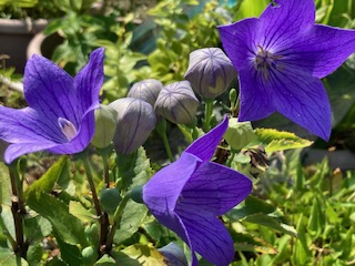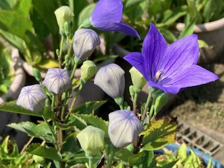 学習園の隅で、桔梗(キキョウ)の花を見つけました。桔梗(キキョウ)は6月頃から秋まで咲く、日本でも古くから親しまれている花です。あざやかな青紫色をしている星形の花と紙風船のようにつぼみが可愛らしくふくらむようすが魅力的です。白色や淡いピンク色もあるそうです。桔梗(キキョウ)は秋の七草としても知られています。それにしてもつぼみがまるで手毬(てまり)のようです。