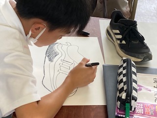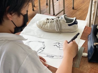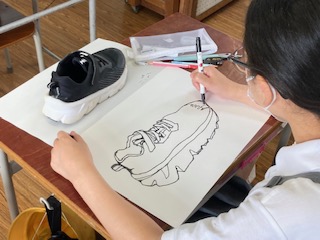 6年生の子どもたちが[線描]に挑戦です。自分のくつを目の前に置いて、穴が空くほどよーく観察します。するとたくさんの線が見えてきました。それらの線はかならずどこかにつながっています。その一本一本をカタツムリが進むスピードでサインペンで描いていきます。少しずつ少しずつ、ゆっくりとていねいに。くつを題材にすることはよくあります。これが意外に難しいのです。でもくつを描くと、どの子の作品もいい感じに仕上がるから不思議です。