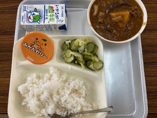 今日の給食のメニューは、夏野菜のカレーライス、キャベツときゅうりのサラダ、みかんゼリー、牛乳、でした。夏野菜のカレーライスは牛肉の旨みを生かしながら夏野菜のかぼちゃ、なす、ピーマンなどを使用していて夏を感じることができました。キャベツときゅうりのサラダはさっぱりとしていてみずみずしかったです。みかんゼリーは一人一個です。