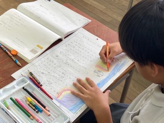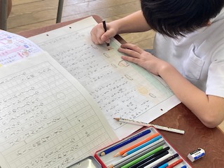 3年生の子どもたちが教科書に載っている詩の視写をしていました。よく字を見て間違えないように、ゆっくりとていねいに。描き終わったら場面を想像して絵を描き加えます。一人一人思い浮かべるシーンが違います。同じ詩でも子どもたちの受け取り方はいろいろあるみたいですね。
