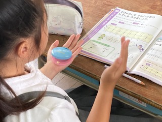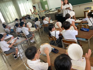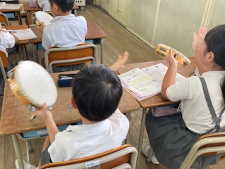 カスタネットとタンバリンの楽しげな音が2年生の教室から聞こえてきました。音楽に合わせて2拍子のリズムでたたいています。カスタネットとタンバリンのパートが違うところもあるので、まどわされて大変かなと思いましたが、子どもたちは器用にリズムをとりながらたたくことができていました。子どもたちの手を開いたり閉じたりする仕草がとてもかわいらしかったです。