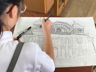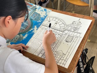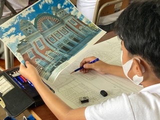 5年生の子どもたちが真剣な表情で絵画の作品に取り組んでいました。11月の作品展に向けて絵画と工作の2点を完成させるには時間がたくさんかかるので、今から少しずつ進めていくようです。題材は[大阪市中央公会堂(通称:中之島公会堂)]です。なかなか難しそうな題材です。きっと一人一人、味のある作品に仕上がると思います。鑑賞のしがいがありますね。
