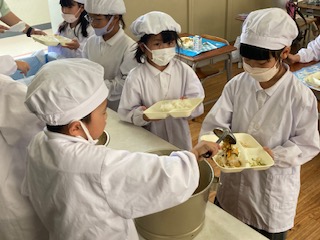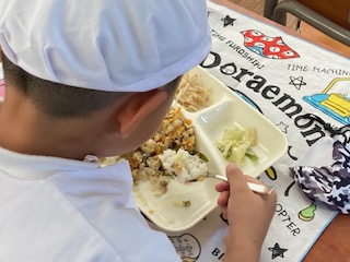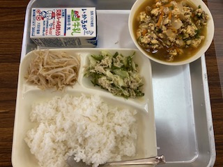 今日の給食のメニューは、他人丼、ささみと野菜の炒め物、もやしの甘酢和え、牛乳、でした。他人丼は牛肉とたまねぎ、にんじんを甘辛く煮て、彩りに青ねぎを加えて卵でとじています。給食では安全上の観点から食材に十分に火を通すきまりがあるので、卵がお店のようなトロトロした感じではなく、どうしても[だま]のようになってしまいますが、でもとてもおいしく、子どもたちも進んで食べています。ささみと野菜の炒め物はささみ、キャベツ、ピーマンを塩、こしょう、しょうゆでシンプルに味つけしています。もやしの甘酢和えはさっぱりしていて中華風でした。