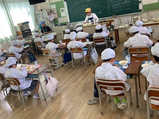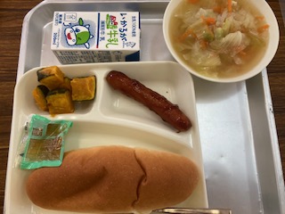 今日の給食のメニューは、ウインナーのケチャップソース、スープ、焼きかぼちゃ、牛乳、パン、でした。ウインナーのケチャップソースはゆでたウインナーにとろみがついたケチャップソースがかかっています。ウインナーは皮がパリッとしていてジューシーでした。スープはチキンスープをベースに塩こしょう、しょうゆで味をととのえてあり、鶏肉、キャベツ、たまねぎ、にんじん、むきえだまめが入っていました。焼きかぼちゃはかぼちゃの自然の甘さが感じられました。