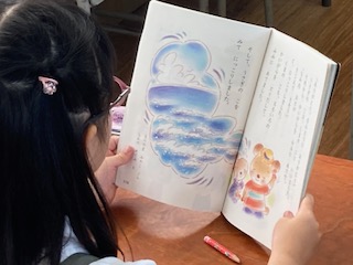 1年生の子どもたちの音読の声が教室から聞こえてきました。国語の教科書をしっかりと手に持って、先生のあとに続いて元気よく読んでいました。[かいがら]というお話で、海で拾ってきた貝殻を介して、くまの子とうさぎの子の心温まるふれあいが描かれています。子どもたちはこのお話を読んで、どんなことを思うのでしょうか。どうだった?…、はじめの感想を先生が尋ねていました。さあ、くまの子の気持ちとうさぎの子の気持ち…、やさしい気持ちやうれしい気持ち…、そして読んだあとの自分の気持ち…、に子どもたちは気づいてくれるかな。