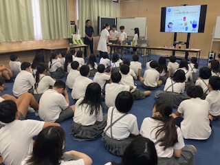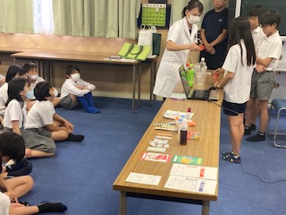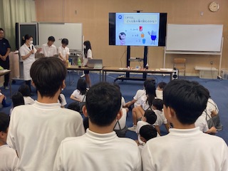 薬剤師の先生に来ていただいて、6年生の子どもたちに[くすりの正しい使い方講座]を行いました。くすりはどんなときに飲めばいいのかな?正しい飲み方ってあるのかな?危険なことはあるのかな?…、いろんな視点から、くすりについて教えてもらいました。水以外の飲み物でくすりを飲んだらどうなるのかという実験もみんなで見ました。薬物乱用とその防止についても話してもらいました。くすりは安全に正しく使わないといけないことがわかりました。