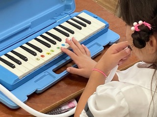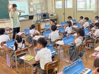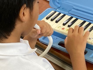 1年生の子どもたちがけんばんハーモニカを配られました。早く音を鳴らしたくて仕方がない様子です。あちこちからフライングの音が聞こえてきます。ブーブー、まだだよ!…、先生が注意します。ブーブーブー…、またまたフライングです。誰かが言いました、なんかおならみたいだね、子どもたちは大笑いです。吹き方でいろいろ変化させていきます。強い音、弱い音、長くのばす音、短く切る音…。さあ[ド]の音を鳴らしてみるよ。みんなで、さんはいっ!けんばんハーモニカっておもしろいね。みんなで吹くと楽しいな。