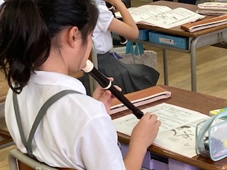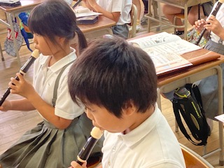 3年生から始まるリコーダー。2学期にもなると、リズムにのってテンポよく、吹くことができるようになる子が増えました。子どもたちも自分たちが少しずつ上手になっていくのがわかるみたいで、リコーダーを吹くのが大好きのようです。先生が新しい指使いや吹き方、練習曲を教えると、うれしそうな顔をしてチャレンジしていきます。子どもたちの吹くリコーダーの音色が響きわたり、教室がとても明るく和やかな雰囲気になっていました。