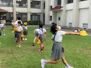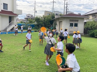 3年生の子どもたちが学習園の草ぬきをした後、芝生広場で大量に飛んでいるトンボの群れに遭遇しました。トンボやー!、トンボいるでー!、めっちゃいるでー!…、子どもたちは自分たちの帽子を振り回してトンボを追いかけます。つかまえろー!…、でもそう簡単には帽子ではつかまえられるわけがありません。それでも子どもたちは楽しそうにトンボを追いかけます。まてー!まてー!そう言えば、ちょうど3年生は理科の学習で、昆虫の体のつくりを勉強しているところですね。授業のネタになりそうです。