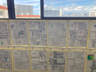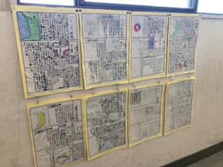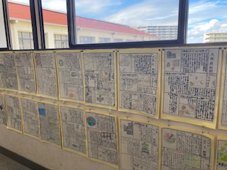 4年生の教室前ろう下に、子どもたちが作った[大阪府新聞]が掲示してありました。社会の学習で自分たちの暮らす大阪について調べたものをまとめて新聞形式で表しています。今回は文章だけでなく絵や図も全部手描きで作成してあったので一人一人味があります。もちろん調べる段階ではパソコンも使っていると思いますが、最近は印刷したものを貼ったりすることも多いので、なんとなく子どもらしさが感じられて懐かしい気持ちになりました。