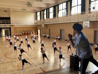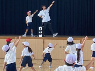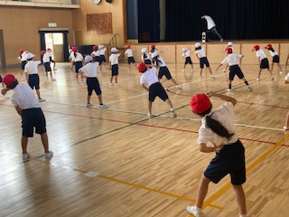 先週までの水泳指導が終わり、さあ次は運動会に向けて動き始めます。一番はじめに講堂にやってきたのは…、1年生の子どもたちです。トップバッターは1年生でした。最初に先生からダンスの音楽を聞かせてもらいます。[それ知ってるーっ!][知らーんっ!]…。さあ、さっそく始めるよ!…、先生の合図でみんな勢いよく立ち上がります。最初は先生のまねっこからです。いいよ、いいよ、いい感じに乗ってきました。まだまだこれからいっぱい覚えないといけません。小学校でのはじめての運転会、楽しい運動会にしようね。