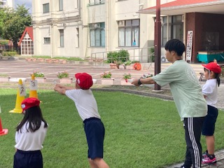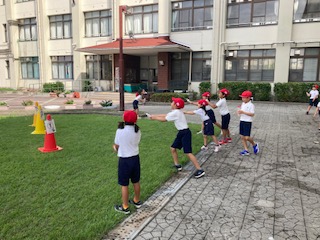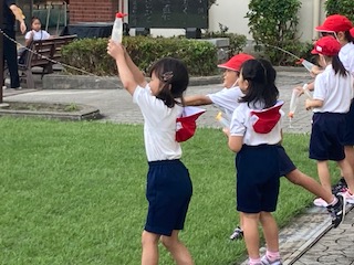 1年生の生活科の学習で[水あそび]があります。水あそびの中にもいろいろありますが、今日、子どもたちが遊んでいたのは、水とばしです。マヨネーズやケチャップの容器に水を入れて、プシュッと勢いよく押さえると水が飛び出します。先生が的を用意してくれました。[やったぁ、当たった、1点や!][ぼくなんか2点やぞ!]…。子どもたちのはしゃいでいる声が響いて、とても和やかな雰囲気です。何度も水を入れに走っている子どもたちの姿がかわいかったです。でも近くの水道がびちょびちょでした。笑