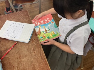 1年生の子どもたちは長さ比べをしていました。机のたてと横の長さを比べるようです。見た目では横の長さの方が長いのはわかるのですが、根拠がいります。でも習っていないので定規は使えません。えんぴつやふでばこ、ノートや教科書、手のひらなどの、ものを使って調べることにしました。例えば教科書いくつ分といった感じです。1年生の子どもたちもたくさんの先生たちが見守る中、素直で明るい笑顔をいっぱい見せながら一生懸命に頑張っていました。