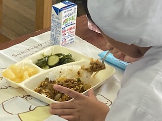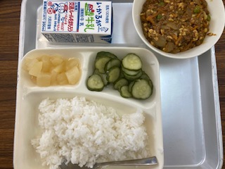 今日の給食のメニューは、大豆入りキーマカレーライス、きゅうりのサラダ、洋なし(缶)、牛乳、でした。大豆入りキーマカレーライスは大豆と豚レバー(チップ)を使っています。レバーは少しくせのある食べ物ですが、細かくした豚レバーをひき肉と一緒に使うことで、食べやすくなるように工夫しています。レバーには血を作る鉄分が多く含まれています。きゅうりのサラダはあっさり味でした。洋なし(缶)は冷たく甘くておいしかったです。