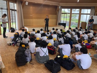 まず開舎式を行いました。宿舎の方から施設の使い方や楽しく安全に過ごしてくださいという話をしていただきました。児童代表が[お世話になります]と言ったあと、みんなで[よろしくお願いします]とあいさつをしました。3枚目の写真は避難訓練の様子です。