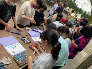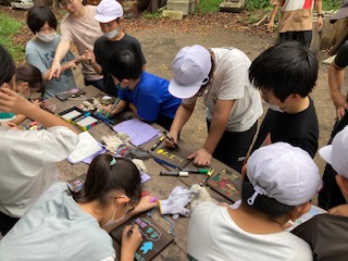 みんな順次、絵付けに入り始めました。大体のデザインや構想は学校で練ってきていますが、いざ現地で描き始めるとなると、周りの様子を見たりして、少し変更している子もいました。焼き板の木目模様が一人一人違うので、それを生かそうとしている子もいました。いいおみやげができそうです。