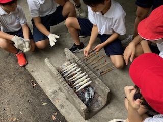 つかまえたあまごに自分でくしを刺して炭火で焼いて食べました。結構みんな平気で自分でくしを刺すことができていました。塩をふって香ばしく焼き色がつくまで、じわじわ育てていきます。身がふっくらしていて[めっちゃおいしいー!]の声でいっぱいです。