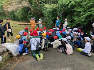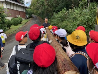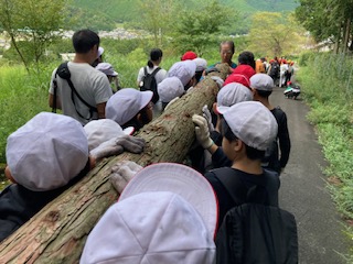 先ほど切り倒した木を丸太にしたものをみんなで協力して運びます。