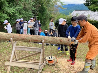 一人一人、自分の手でチェンソーを使って丸太から切り落としました。小型のチェンソーですが手を添えてもらいながら切り落とすことができました。林間学習のいいおみやげができましたね。何に使おうかな。巨大コースターか、それとも鍋敷きか…。工夫次第です。