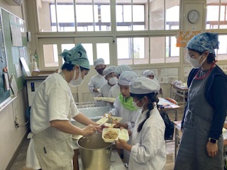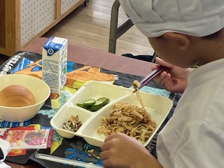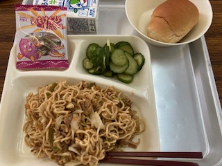 今日の給食のメニューは、焼きそば、きゅうりの生姜づけ、芋けんぴフィッシュ、牛乳、パン、でした。焼きそばは豚肉とイカをメインにしたソース味で仕上げています。麺はちぢれ麺で食感もよく、ていねいに細かく刻まれたにんじん、たまねぎ、ピーマン、キャベツも入っていました。きゅうりの生姜づけはさっぱりとしていて、ほんのり生姜の香りがしました。芋けんぴフィッシュは国産のかたくちいわしとさつまいもを使っていて、給食初登場です。