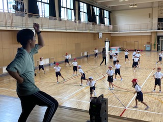 先生の数えるリズムに合わせて、1年生の子どもたちが元気にからだを動かしています。[はい、そこで手をあげて!][はい、ここでまわります!]…、先生が舞台の上で見本を見せながら一緒に踊っています。音楽をかけると、子どもたちの動きが、さらに軽やかになっていきます。なんか気持ちもウキウキしてきちゃう1年生の子どもたちです。
