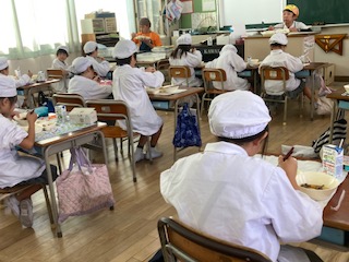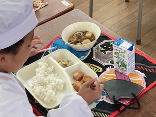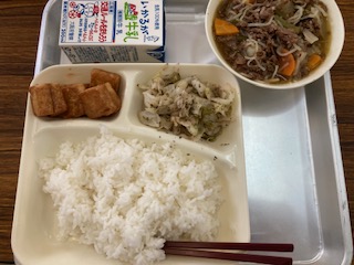今日の給食のメニューは、肉じゃが、厚揚げのみそだれかけ、キャベツの赤じそ和え、牛乳、ごはん、でした。肉じゃがは牛肉の旨みが十分に出ていて具材も多く、ごはんが進みました。厚揚げのみそだれかけは赤みそと砂糖、しょうゆで作った特製タレがかけられていて濃厚な味わいでおいしかったです。キャベツの赤じそ和えは口あたりがよく、さっぱりとしてさわやかな感じでした。