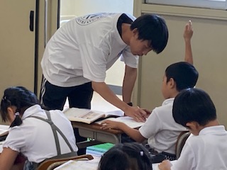 1年生の子どもたちが算数の授業で計算の勉強をしています。一つの式に表して計算していきます。つまり式は7+3−8です。順番に計算して7+3=10、10−8=2となるのですが、何となく頭の中でその流れを構成して、答えを一気に出していく力を身につけなくてはいけません。子どもたちは計算ができると、手をあげて◯をつけてもらっていました。