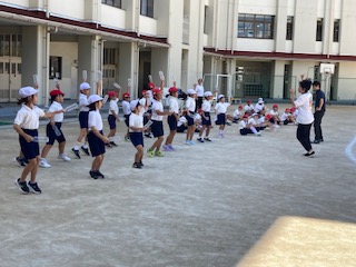 運動会に向けて、どの学年も練習が本格化してきています。これまでは講堂で基本的な動きを練習することが多かったですが、これからは運動場で練習することが増えてきます。まずは3年生の子どもたちの登場です。熱中症に備えて日陰での練習を工夫したり、お茶タイムを取ったりしながら、自分の位置の確認や隊形移動の練習をしていました。やっぱり外だと開放感があっていいですね。