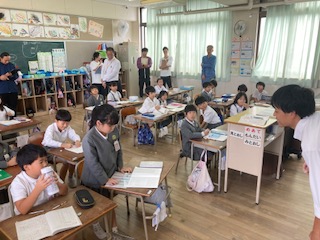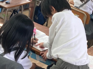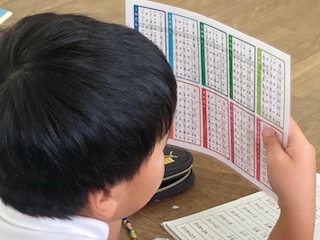 2年生の算数の授業では、少し前から九九の学習が始まっています。まず最初に5の段、次に2の段、そして今日は3の段です。3の段の九九をみんなで唱えたり、3の段を使った問題に取り組んだりしました。今日は他の先生たちも見に来てくれました。子どもたちは張り切って元気よく発表したり、友だちと自分の考えを伝え合ったりすることができていました。最後のふり返りでは、[早く9の段を勉強したいです]とか[全部言えるようになりたいです]とか…、子どもたちのあつい意気込みが聞かれました。