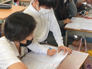 運動会の練習の合間でも、学習ももちろん集中して取り組んでいます。6年生の教室をのぞいてみると、とても落ち着いた様子で授業が進んでいました。今、算数では図形の拡大と縮小について勉強しています。これから拡大図や縮小図の作図の仕方について入っていきます。6年生はいろいろな場面でリーダーとして頑張らないといけないので大変忙しいのですが、このような温かい授業風景を見るとホッとして安心しますね。
