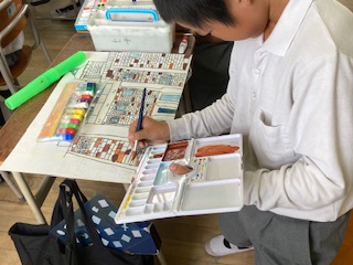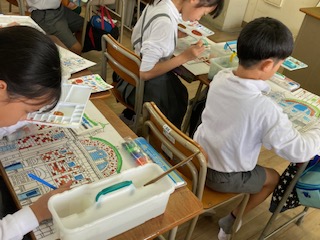 [細かいところまでこだわって、最後までねばり強く取り組んでいきましょう。]…、先生の声かけに子どもたちも集中力を高めて、時間を忘れて黙々と筆を動かしていきます。5年生の子どもたちは大阪市中央公会堂(中之島公会堂)を描いています。下描きのレンガや窓の一つ一つを微妙に色を変えながら細かく小筆で仕上げていきます。中にはあまりに夢中になりすぎて、思わず立ち上がって色をぬっている子もいました。きっと大作になると思いますよ。