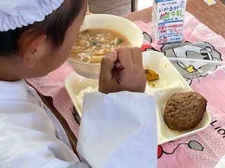 今日の給食のメニューは、和風ハンバーグ、みそ汁、かぼちゃのいとこ煮、牛乳、ごはん、でした。和風ハンバーグは肉厚でまあまあボリュームがあり、手づくりの和風ダレがかけられています。みそ汁はじゃがいも、うすあげ、はくさい、たまねぎ、青ねぎが入っていました。かぼちゃのいとこ煮はかぼちゃの甘みと小豆の甘みが合わさっておいしかったです。[いとこ煮]とは、野菜や豆を煮るときに[追い、追い(甥、甥)煮る]ことから、甥同士はいとこであるため[いとこ煮]と呼ばれるようになったと言われています。ほんとかな?諸説あるそうです。