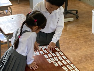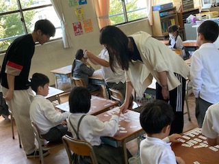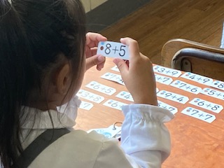 1年生の子どもたちが算数の授業で[なかまあつめ]をしていました。くり上がりの計算をした答えが同じになるものを集めて並べています。例えば、2+9=11、4+7=11や、6+8=14、7+7=14などです。計算カードを使ってトランプの七並べのように仲間分けして並べていました。最後に先生や友だちと一緒にそれぞれが合っているか確認していきます。みんなちゃんとできていましたよ。