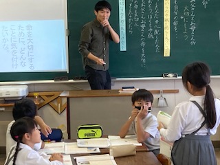 3年生の道徳の授業です。子どもたちは[生まれた時から体が病弱ですぐに大きな手術をしなければならず、でも今は元気に成長して頑張っている子のお話]を読んで、感じたことや思ったことなどをお互いに交流し合いました。手術のとき家族はどんな気持ちだったのだろうか。今まで元気に育ってどう思っているのかな。命が生まれて育つとはどういうことだろうか。命を大切にするためにはどうしたらいいのかな。…子どもたちは先生と一緒に考えながら、命の大切さについて思いを深めることができました。