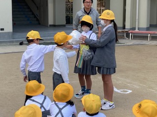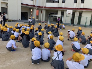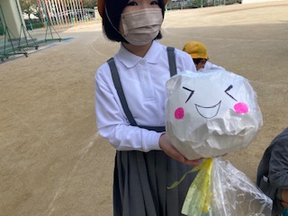 児童朝会の後に1年生から6年生にその場に残ってくださいと声をかけられました。何だろう?1年生から6年生にプレゼントがあるそうです。今週の木曜日と金曜日に6年生の子どもたちは修学旅行に出かけます。そこでいつも6年生のお兄さんお姉さんに優しくお世話をしてもらっている1年生の子どもたちが何かお礼がしたいということで、ジャンボてるてるぼうずのプレゼントです。6年生の子どもたちは突然のサプライズに少しとまどいながら、照れた様子でみんなで[ありがとう、行ってきます]と答えていました。朝からほのぼのとした和やかな場面が見られました。