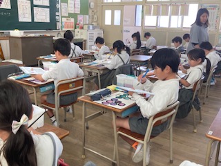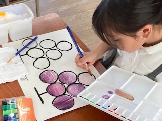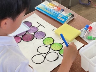 2年生の子どもたちが絵の具の使い方について学習しています。最初にしっかりと基本を覚えることが大事です。筆の使い方、パレットの使い方、ひっせん(筆洗)の使い方、机の上の使い方…、これから絵の具を使っていく上での基本となります。今日は2色を使って少しずつ混ぜたり水の量を調節したりしながら、ぶどうの絵を描きました。まず赤色と青色を使うのはみんな共通ですが、もう一つは何色と何色でもかまいません。縦向きにぬったり横向きにぬったり、波線でぬったりぐるぐる巻きにぬったり…。
