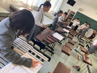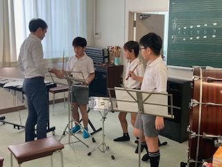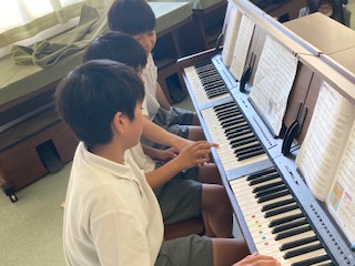 5年生の子どもたちの楽器を演奏する音が音楽室から聞こえてきました。キリマンジャロという曲です。それぞれの楽器ごとに分かれて練習していきます。先生が各パートを回りながら、細かくていねいに教えていきます。まだ練習を始めたばかりなので、みんなで合わせるところまではいかないけれど、みんなで合奏できたら、きっと楽しいだろうなと思うので、頑張って練習してほしいと思います。