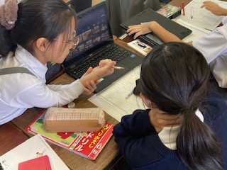 日本では衣食住のどれにも[和]と[洋]が入り混じっています。例えば部屋には和室と洋室があり、和室ではたたみに直接座り、洋室ではフローリングでいすに腰掛けます。4年生の国語の授業で[くらしの中の和と洋]という説明文の学習です。まず子どもたちはそれぞれ[衣][食][住]において、どんな[和]と[洋]があるだろうかと意見を出し合いました。でもいざ考えてみると、なかなかパッとたくさんは出てきません。そこでグループごとに協力しながらパソコンを使って調べることにしました。