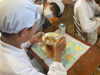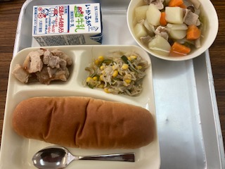 今日の給食のメニューは、鶏肉のガーリック焼き、スープ煮、野菜のソテー、牛乳、パン、でした。鶏肉のガーリック焼きは弾力ある鶏肉をガーリックの香りと香ばしさとともに味わえました。スープ煮はチキンスープをベースに、豚肉、じゃがいも、たまねぎ、にんじん、しめじ、さんどまめが入っていて彩りもきれいでした。野菜のソテーはもやしとピーマン、コーンをソース風味の味つけで炒めています。