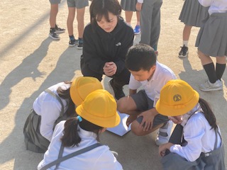 午後2時頃、寒くもなく暑くもなく、ぽかぽか陽気の陽だまりの中で、3年生の子どもたちが定期的に日なたと日かげの土の中の温度を測っています。でもそれよりもぽかぽか陽気がとにかく気持ちよくて、ゆっくりのんびりとおしゃべりでもしたい気分です。ということなので、子どもたちは一応気温を測りながらのおしゃべりタイム中です。