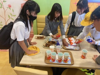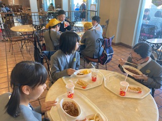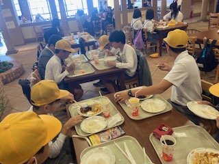 お昼ごはんはいくつかの店から選んで食べます。ハンバーガーやポテト、カレーライス、オムライス、焼きそば、ラーメン、ハンバーグライスなど、自分たちで相談して好きなものを食べていました。ちなみにこの写真は1時間くらい前に撮りました。園内が広くて他校もたくさん来ているので、なかなか大道南の子たちのいい場面に出会えません(泣)。記事を書いている間に姿を見失ってしまいます。でもそれだけ子どもたちも楽しんで活動しているということですね。