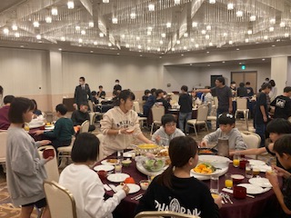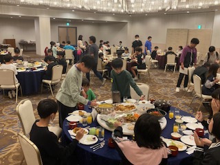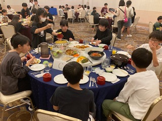 18:00より宴会場にて夕食会をしました。天井のシャンデリアに子どもたちもとても喜んでいました。なんかホテルみたい?って、ホテルなんやけどってツッコミが…。円卓に料理が並べてあり、みんなで囲みます。お互いに向き合って食べるので、取り分けながら当然話もはずみます。いっぱい活動したので、みんなお腹がぺこぺこです。おかずもごはんも十分にあり、何杯もおかわりしている子がたくさんいました。これも思い出の一つになりましたね。