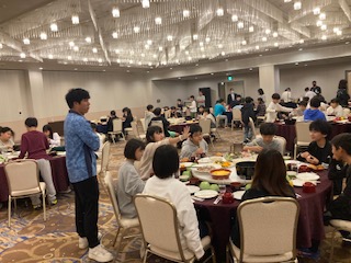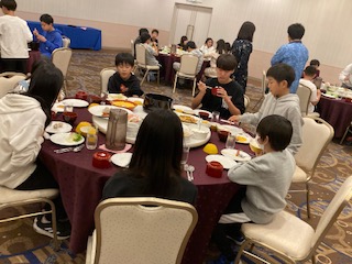 朝食のようすです。夕食と同じように円卓を囲んで、みんなで楽しく食べています。メニューも豊富で、パン派とごはん派に分かれていました。飲み物も牛乳、オレンジジュース、トマトジュースのほかに、コーヒーもあったのですが、割とコーヒーを飲んでいる子たちがいました。大人ですね。それでは今日も一日しっかりと活動していきましょう。