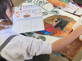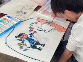 2年生の子どもたちが絵画作品に取りかかっています。テーマは自分が選んだお話の中の一場面に自分自身を登場させるということです。お話の中で自分はどんな役割を果たすのでしょうか。もしかしたらストーリーが変わってしまうかもしれませんね。子どもたちは本格的に絵の具を使って絵を描くのは初めてなのですが、一人一人の様子を見ていると、とてもていねいに落ち着いて作業を進めていました。
